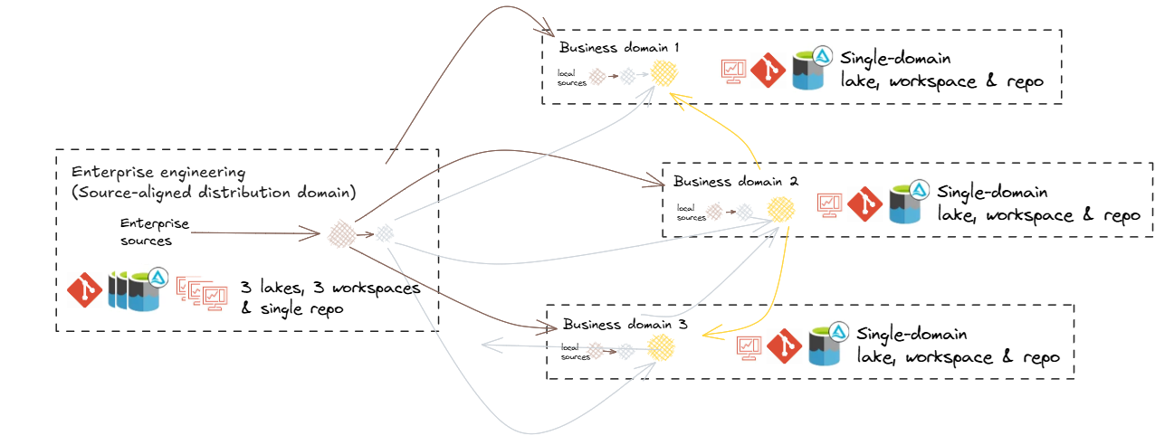 - Combines centralised governance with domain-specific autonomy.