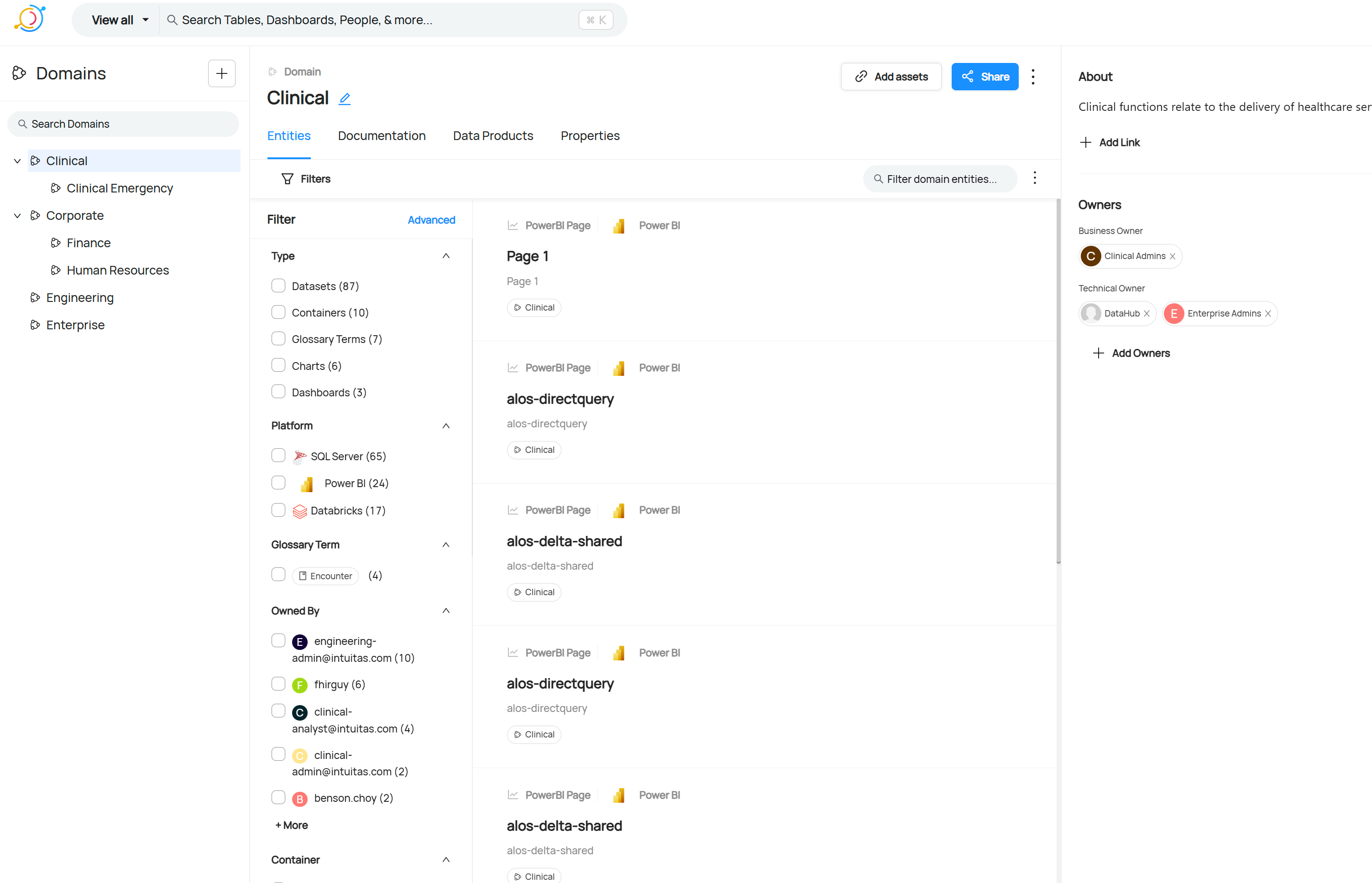 - Enterprise metadata – consistent definitions, lineage, and discovery across all domains via shared catalog.